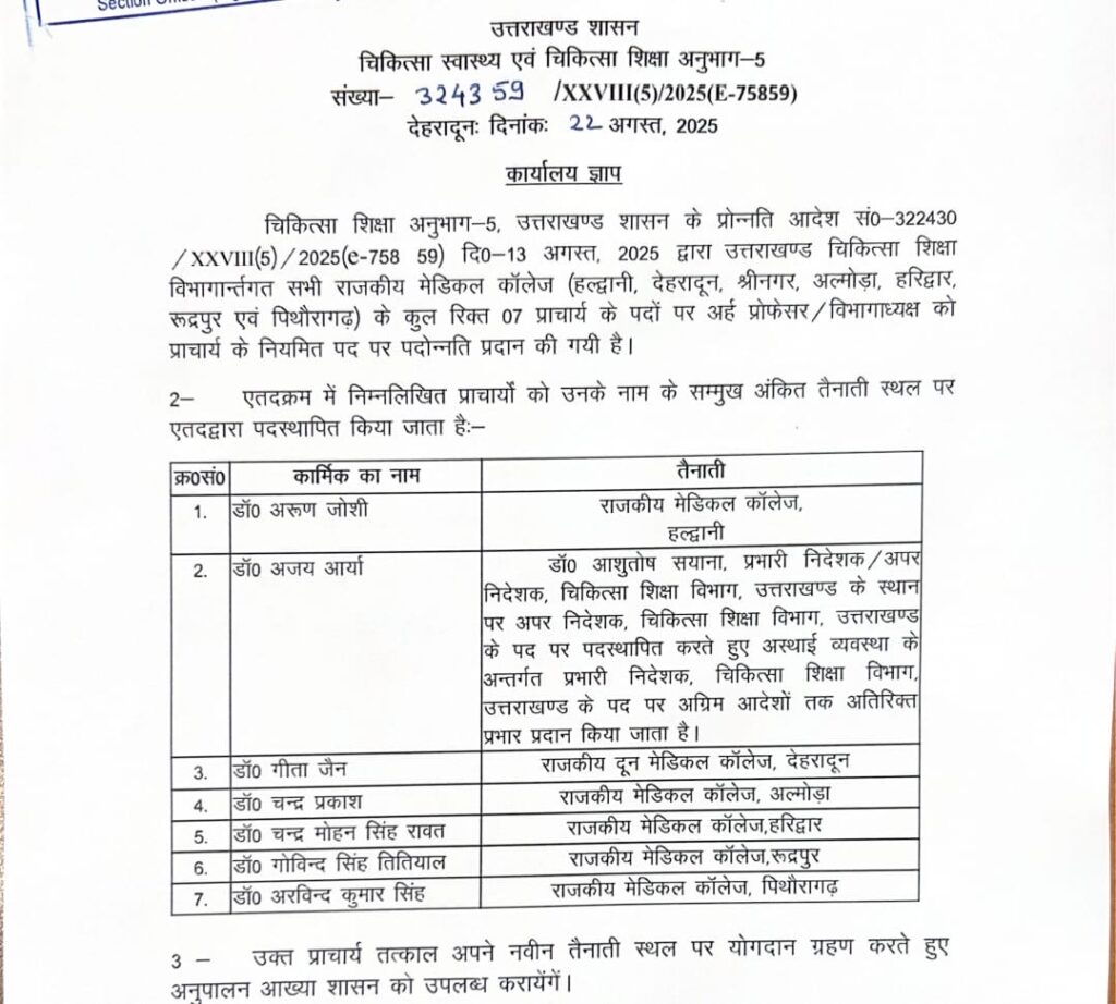 देहरादून। उत्तराखंड सरकार ने चिकित्सा शिक्षा विभाग में बड़ा प्रशासनिक फेरबदल किया है। सरकार ने डॉ. अजय आर्य को चिकित्सा शिक्षा निदेशक की जिम्मेदारी सौंपी है। आदेश जारी होने के बाद उन्होंने अपना कार्यभार संभाल लिया है।