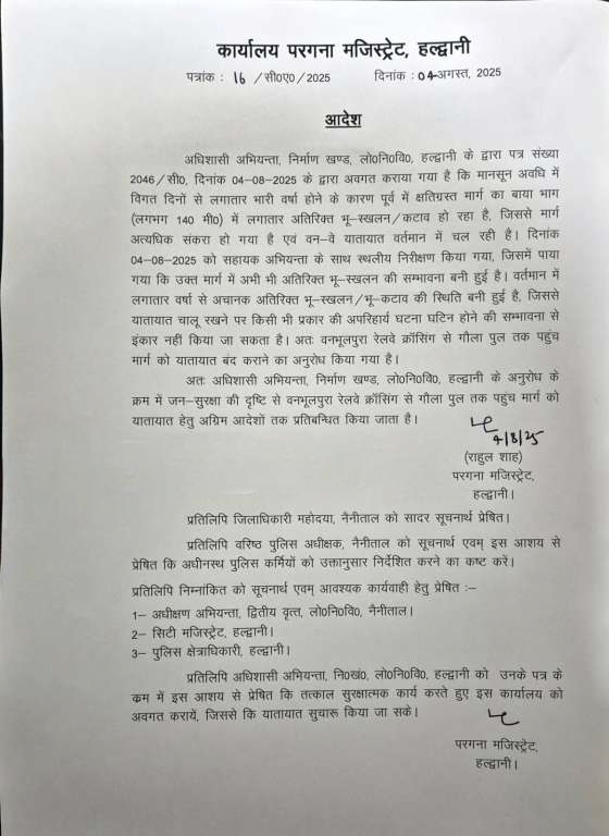 हल्द्वानी: लगातार हो रही मूसलधार बारिश के चलते हल्द्वानी क्षेत्र में भू-स्खलन का खतरा लगातार बढ़ता जा रहा है। उपजिलाधिकारी कार्यालय से प्राप्त जानकारी के अनुसार, वनभूलपुरा रेलवे क्रॉसिंग से गौला पुल तक का मार्ग अब जन-सुरक्षा की दृष्टि से अग्रिम आदेशों तक यातायात के लिए पूरी तरह से प्रतिबंधित कर दिया गया है।निर्माण खण्ड, लोक निर्माण विभाग, हल्द्वानी द्वारा जारी पत्र में अवगत कराया गया है कि उक्त मार्ग पर बीते कुछ समय से लगातार अतिरिक्त भू-स्खलन और कटाव हो रहा है। जिससे मार्ग का बायां भाग लगभग 140 मीटर तक अत्यधिक संकरा हो गया है और केवल वन-वे यातायात ही संचालित हो पा रहा था।दिनांक 4 अगस्त को सहायक अभियंता के साथ किए गए स्थलीय निरीक्षण में भी यह स्पष्ट हुआ कि मार्ग की स्थिति अत्यंत असुरक्षित है और लगातार हो रही वर्षा के कारण भू-स्खलन की संभावनाएं बनी हुई हैं। किसी भी आकस्मिक दुर्घटना से बचाव हेतु लोक निर्माण विभाग द्वारा इस मार्ग को तत्काल प्रभाव से बंद करने की संस्तुति की गई थी।परगना मजिस्ट्रेट राहुल शाह द्वारा इस संस्तुति को स्वीकार करते हुए आदेश जारी किया गया है कि वनभूलपुरा रेलवे क्रॉसिंग से गौला पुल तक के मार्ग पर अग्रिम आदेशों तक यातायात पूरी तरह से प्रतिबंधित रहेगा। प्रशासन ने नागरिकों से अपील की है कि वैकल्पिक मार्गों का उपयोग करें और किसी भी प्रकार की आपात स्थिति में स्थानीय प्रशासन से संपर्क करें।