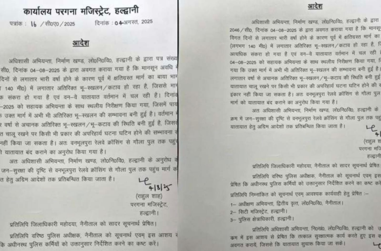 हल्द्वानी: लगातार हो रही मूसलधार बारिश के चलते हल्द्वानी क्षेत्र में भू-स्खलन का खतरा लगातार बढ़ता जा रहा है। उपजिलाधिकारी कार्यालय से प्राप्त जानकारी के अनुसार, वनभूलपुरा रेलवे क्रॉसिंग से गौला पुल तक का मार्ग अब जन-सुरक्षा की दृष्टि से अग्रिम आदेशों तक यातायात के लिए पूरी तरह से प्रतिबंधित कर दिया गया है।निर्माण खण्ड, लोक निर्माण विभाग, हल्द्वानी द्वारा जारी पत्र में अवगत कराया गया है कि उक्त मार्ग पर बीते कुछ समय से लगातार अतिरिक्त भू-स्खलन और कटाव हो रहा है। जिससे मार्ग का बायां भाग लगभग 140 मीटर तक अत्यधिक संकरा हो गया है और केवल वन-वे यातायात ही संचालित हो पा रहा था।दिनांक 4 अगस्त को सहायक अभियंता के साथ किए गए स्थलीय निरीक्षण में भी यह स्पष्ट हुआ कि मार्ग की स्थिति अत्यंत असुरक्षित है और लगातार हो रही वर्षा के कारण भू-स्खलन की संभावनाएं बनी हुई हैं। किसी भी आकस्मिक दुर्घटना से बचाव हेतु लोक निर्माण विभाग द्वारा इस मार्ग को तत्काल प्रभाव से बंद करने की संस्तुति की गई थी।परगना मजिस्ट्रेट राहुल शाह द्वारा इस संस्तुति को स्वीकार करते हुए आदेश जारी किया गया है कि वनभूलपुरा रेलवे क्रॉसिंग से गौला पुल तक के मार्ग पर अग्रिम आदेशों तक यातायात पूरी तरह से प्रतिबंधित रहेगा। प्रशासन ने नागरिकों से अपील की है कि वैकल्पिक मार्गों का उपयोग करें और किसी भी प्रकार की आपात स्थिति में स्थानीय प्रशासन से संपर्क करें।
