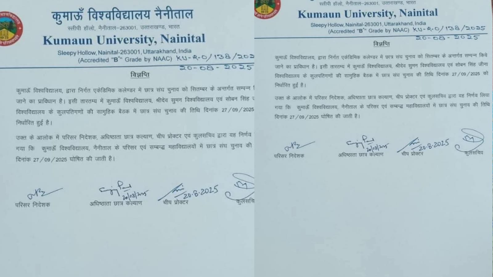 नैनीताल – कुमाऊँ विश्वविद्यालय में छात्र राजनीति का लंबे समय से चला आ रहा इंतज़ार अब समाप्त हो गया है। विश्वविद्यालय प्रशासन ने आधिकारिक रूप से घोषणा करते हुए साफ कर दिया है कि छात्र संघ चुनाव आगामी 27 सितम्बर 2025 को कराए जाएंगे।