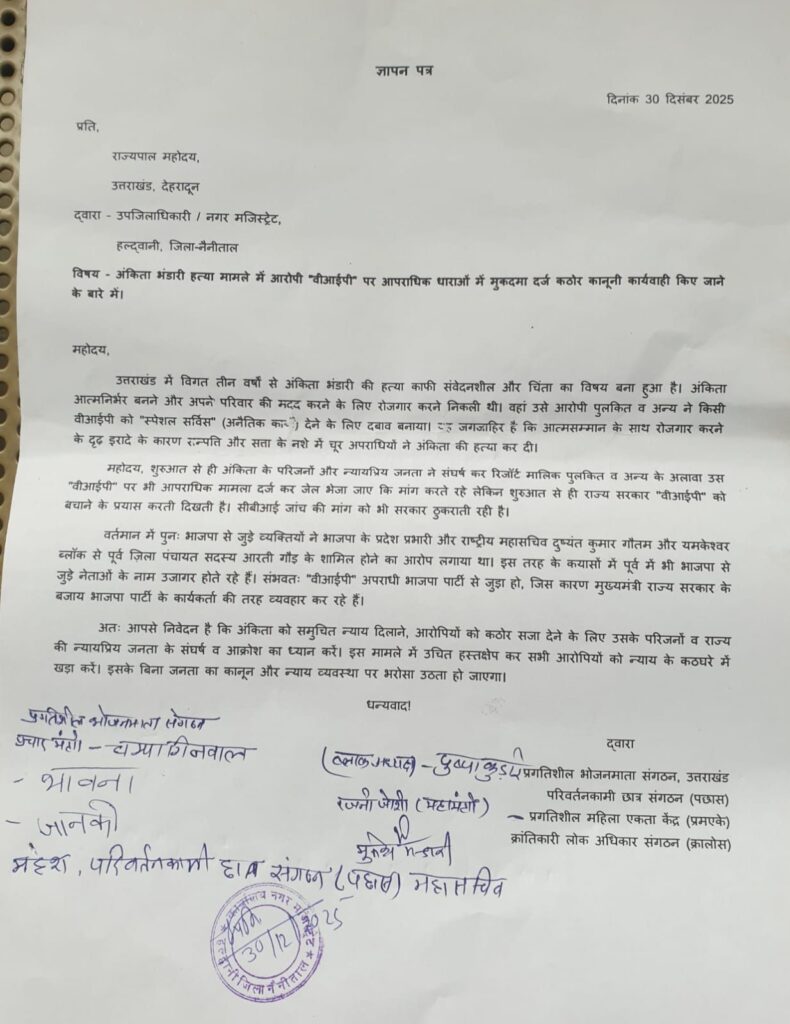 शुरुआत से ही अंकिता के परिजनों और न्यायप्रिय जनता ने संघर्ष कर रिजॉर्ट मालिक पुलकित व अन्य के अलावा उस “वीआईपी” पर भी आपराधिक मामला दर्ज कर जेल भेजा जाए कि मांग करते रहे लेकिन शुरुआत से ही राज्य सरकार “वीआईपी” को बचाने के प्रयास करती दिखती है। सीबीआई जांच की मांग को भी सरकार ठुकराती रही है।